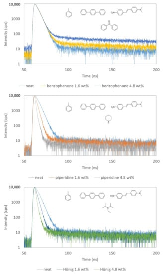 A possible photoluminescence quenching of p-terphenyl and p-quaterphenyl with benzophenone or hindered amines was also tested with piperidine or N,N-diisopropylethylamine (also known as Hünig’s base). At least in the toluene medium (Table 3), all three quenchers proved their efficiency with the best results observed for p-terphenyl quenched with piperidine. Thus, starting with already fast materials (<τ> = 1.45 and 1.11 ns for p-terphenyl and p-quaterphenyl, respectively), quenching leads to decay values close to 1 ns, placing them in the range of the instrument response function provided by the NanoLED characteristics (Figure 1). At this stage, no care was taken on the photoluminescence or even scintillation efficiency.