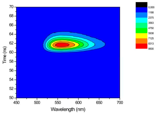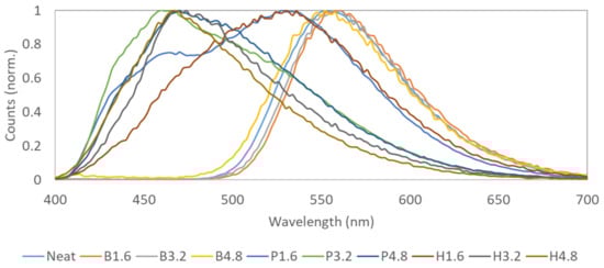 The first observation is the fact the DANS-based scintillators are not as fast as their liquid equivalents, with TCSPC values giving around 4 ns. This was already observed for Nile red-based scintillators []. The radioluminescence spectra show emission wavelengths that are in agreement with the photoluminescence spectra.
