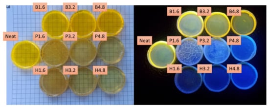 Scintillators composed of polystyrene containing p-terphenyl, DANS, and quenchers, under visible light (left) and 368 nm UV (right), pictured 18 months after preparation. B, P, and H stand for benzophenone, piperidine, and Hünig’s base, respectively with their added concentration in wt %.