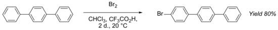 Among other strategies [], the intramolecular heavy atom quenching was assessed by adding one or two bromine atoms on the para positions of p-terphenyl. It seems that the fastest UV-emitting plastic scintillator ever described was prepared according to this approach []. Thus, 4-bromo-p-terphenyl was synthesized according to a published procedure []. According to Scheme 1, bromine reacted on p-terphenyl in a mixture of dichloromethane and trifluoroacetic acid and readily afforded 4-bromo-p-terphenyl with an 80% yield. Except N-(2-ethylhexylcarbazole) which was also prepared, all other tested molecules were used with commercial grade and no further purification. For all scintillators described thereafter, it is noteworthy that the solutions were not degassed so as to allow dissolved oxygen to act as a potential quencher of long-lived stated. The results of 19 different benchmarked molecules are given in Table 2. A non-linear fitting was chosen between single or biexponential decay so that the χ2 fitting value was restricted to the range 1.00–1.20. Some of these molecules are known to display either a concentration-dependent (2,5-diphenyloxazole, N-(2-ethylhexyl)carbazole, pyrene), or an oxygen-sensitive (naphthalene, pyrene) decay time. Therefore, these results have to be considered as a fast qualitative survey of family of molecules that could be suitable to the foreseen application. The results show that phenylene- and PBD-derivatives are of particular interest in this context. In the oligophenylene series, the photoluminescence decay time shortens when increasing the number of phenyl groups, however at the expense of the solubility of the molecule.