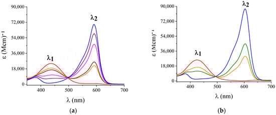 VIS spectra of BPB solutions at various pH values: (a) pH = 1.19 (red); 3.80 (orange); 3.99 (brown); 4.59 (magenta); 4.87 (violet); 6.59 (blue); (b) pH = 1.19 (red); 2.39 (orange); 2.60 (olive); and 4.47 (blue). The total concentration of the buffer solutions is constant and equal to ≈0.08 M. In (b) CT = 0.0123 M CTApTs.