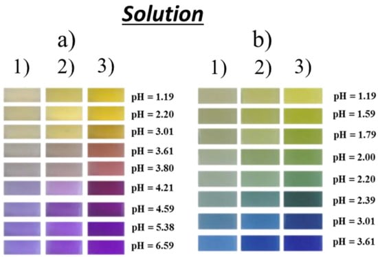 The colors of the BPB solutions, as a function of pH, are shown in Figure 2 without T (a), with (b) T, and with three concentrations of BPB (1, 2, 3). In series (a), the color changed from yellow–orange to purple, and in (b) from yellow–green to blue. Close to the values (4.19 (a), and 2.76 (b)) the color was purple without T and green–blue in its presence.