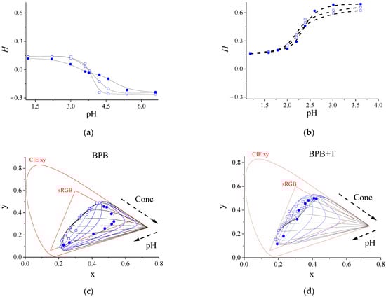 BPB calibration curves H vs. pH without (a) and with T (b). Symbols and lines are the experimental (solutions of Figure 2) and the simulated data, respectively. pH values: 1.19, 2.20, 3.01, 3.61, 3.80, 4.21, 4.59, 5.38, 6.59 in (a) and 1.19, 1.59, 1.79, 2.00, 2.20, 2.39, 3.01, 3.61 in (b). = −4.54 (□), −4.24 (○), −3.91 (●). (c) and (d) same data as (a) and (b) located in the CIE-xy and s-RGB color-spaces domains. The arrows indicate the direction of the BPB concentration and pH changes.