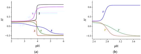 Simulated H profiles vs. pH, parametric in log CI, in the absence (a) and presence of surfactant (b). (a) = −5.51 (purple, 1), −4.46 (black, 2), −4.43 (red, 3), −4.25 (green, 4), −3.80 (blue, 5). (b) = −3.90 (blue, 1′), −3.71 (red, 2′), −3.50 (green, 3′).