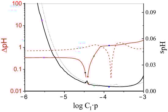 The shapes of the reported calibrations determine the entity of the error. Figure 5 shows the trend of the parameters spH (precision error), and ∆pH (working interval) in the absence (full curves) and presence of surfactant (dashed curves) vs. . The colored symbols refer to the curves of Figure 4a. In general, spH decreases with the increase in , since ∆ increases with the concentration more than the slope decreases. It occurs up to a value of close to −3.82. At larger values of spH increase as the color saturates approach black. The prediction error between = −4.45 and −4.00 is minimum and approximately constant. Between −4.43 and −4.31, the inversion takes place so that spH slightly increases passing close to the achromatic point—where the color is absent and S = 0.