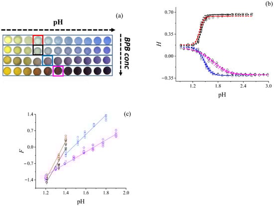 (a) CSA vs. pH and BPB concentration. Only one spot was reported for each BPB concentration, at 11 pH values. The squares highlight the color variation from green to brown near the . (b) H profiles vs. pH of the CSAs prepared with solutions with increasing BPB concentration (8 repeated spots for each concentration): 1 (red curve; ○); 2 (black curve; ▽); 3 (blue curve; □); 4 (purple curve; ◊) of Section 2.2. (c) Corresponding linearization profile F of (a) vs. pH.