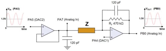The portable sensor system has been designed to allow quick and easy evaluation of the olive oil quality grade in the field. All electrical measurements, data processing and data filing are carried out using the electronic board that is shown in Figure 1b. The electronic board integrates an LCD screen to display the measurement results, four buttons for user interaction and a USB port that can be used to power the sensor system as well as to transfer the measured data to a PC for further data analysis. The core device of the electronic board is a microcontroller produced by ST Microelectronics (STM32L152RCT6A) which is responsible for the generation of the test signal, the acquisition and processing of all signals, and the control of all the electronic components of the board. Different commercial electronic devices are integrated on the electronic board to design the analogue circuits for the measurement of the emulsion electrical conductance. A schematic diagram of the measurement circuit is shown in Figure 2. The sinewave test signal VIN(t) is generated with the 12-bit DAC integrated in the microcontroller and applied to the sensor vial electrodes. The current through the electrodes IOUT(t) is converted to a voltage signal VOUT(t) using a trans-impedance amplifier with a feedback impedance composed of the parallel of a 470 kΩ resistor and a 120 pF capacitor. The sinewave voltage signals VIN(t) and VOUT(t) are acquired with the 12-bit ADC integrated in the microcontroller, processed to calculate the sinewave parameters and the emulsion electrical conductance. A temperature sensor (MCP9700A) is integrated in the electronic board to make measurements of environmental temperature to compensate variations in the emulsion electrical conductance with temperature.