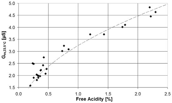 The subset of 31 olive oil samples, characterized by a peroxide index < 20, was tested with the portable sensor system, using HAS as reagent. In Figure 3, the emulsion electrical conductance at 23.5 °C (Gm,23.5°C) is plotted vs. the free acidity determined by the reference titration technique. A correlation exists between Gm,23.5°C and the olive oil free acidity. The best-fit curve that correlates the two parameters is defined by the following equation: