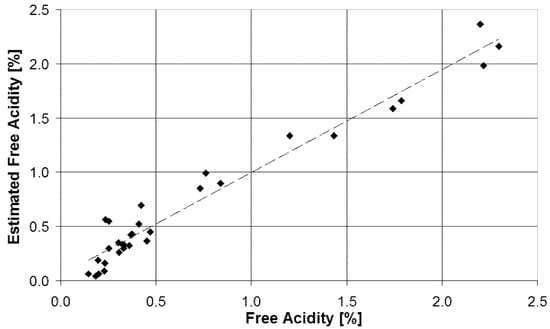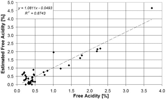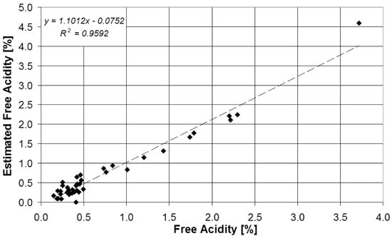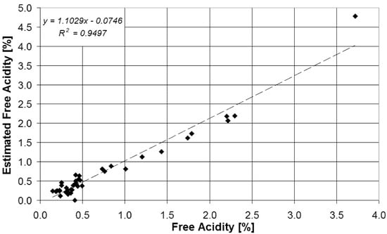 If the calculated value of free acidity with the compensation algorithm is lower than 0, then a free acidity of 0% is assumed. The results are shown in Figure 11, Figure 12, Figure 13 and Figure 14, where the estimated value of free acidity is plotted vs. the free acidity determined with the reference titration procedure, and the linear regression line and the coefficient of determination (R2) are calculated. In Figure 11, the free acidity is estimated without any compensation algorithm (i.e., using Equation (9)) and this results in low accuracy and a low coefficient of determination (R2 = 0.6647). In Figure 12, the free acidity is estimated using the compensation algorithm of Equation (13) and the polynomial function of order 1. The free acidity accuracy is increased and a coefficient of determination of 0.8743 is obtained. The use of a linear function to best-fit the data of Figure 10 allows us to increase the accuracy for the samples featuring high values of free acidity, but produces an accuracy decrease in the case of samples with low values of free acidity. Finally, in Figure 13 and Figure 14, the free acidity is estimated using the compensation algorithm of Equation (13) and the polynomial function of order 2 and 3, respectively. In this case the free acidity accuracy is strongly increased for the full set of samples and coefficients of determination of 0.9497 and 0.9592 are obtained, respectively.