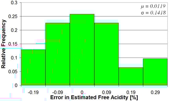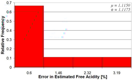 Histogram for the error in the estimated free acidity in the case of fresh samples (i.e., samples featuring a peroxide index < 20 meq O2/kg).