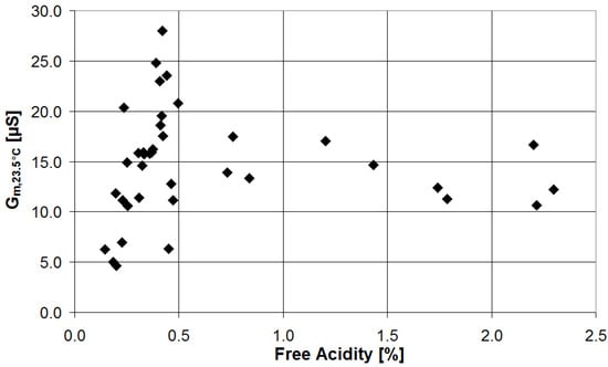 Scatter plot of the emulsion electrical conductance measured at 23.5 °C using the HAS reagent vs. free acidity for the subset of olive oil samples featuring a peroxide index < 20 meq O2/kg oil.