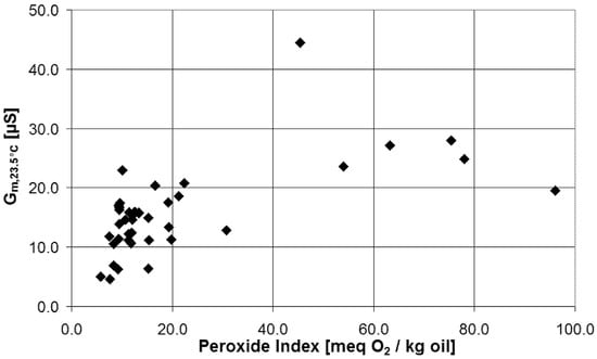 Measurements have also been carried out to investigate if the emulsion electrical conductance, using DW as reagent, can be used to improve the accuracy in the free acidity estimation, in the case of oxidized virgin olive oil samples. The emulsion electrical conductance at 23.5 °C, in the case of DW reagent, is plotted vs. free acidity in Figure 8 and vs. peroxide index in Figure 9, for the full set of olive oil samples. A Pearson correlation test with a 5% significance level was carried out to evaluate the presence of correlation between the emulsion electrical conductance and the quality parameters (free acidity and peroxide index). The correlation between the electrical conductance and the free acidity is characterized by a p-value of 0.263 (>0.05), thus, the null hypothesis of absence of correlation cannot be rejected. The correlation between the electrical conductance and the peroxide index is characterized by a p-value < 0.0001, thus, the null hypothesis of absence of correlation is rejected. Thus, the emulsion electrical conductance at 23.5 °C, using DW as reagent, is uncorrelated with the sample free acidity but presents a correlation with the sample peroxide index.
