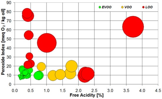 In Figure 15, the correlation between the olive oil quality parameters (free acidity and peroxide index) and the HAS emulsion electrical conductance at 23.5 °C is evaluated, where each sample is represented by a circle of different colours, depending on the quality grade established according to free acidity and peroxide value (EVOO, VOO and LOO), while the circle diameter represents the emulsion electrical conductance at 23.5 °C. In general, samples of lower-quality grades are characterized by higher values in the circle diameter (thus, higher emulsion electrical conductance).