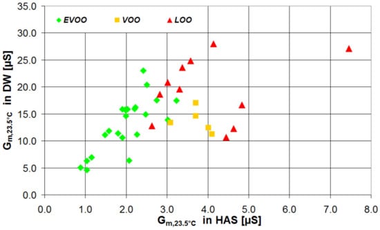 As a second step, measurements have also been carried out on the full set of 40 olive oil samples, using both HAS and DW as reagent, calculating the emulsion electrical conductance at 23.5 °C in the case of both reagents, to investigate if two different measurements can provide higher accuracy in the classification of the sample quality grade. A scatter plot presenting the tested olive oil samples, classified with three quality grades (EVOO, VOO, LOO) as a function of the emulsion electrical conductance at 23.5 °C, using HAS and DW as reagents, is presented in Figure 16.