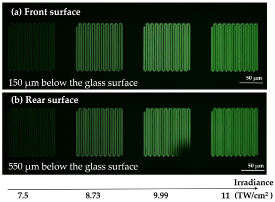 Microscopy fluorescence image of ARGOi glass sample (excitation at 365 nm) of laser-inscribed structures for the different writing irradiances at two different depths: (a) structures at 150 µm below the glass front surface, (b) structures at 550 µm below the glass front surface, and at 150 µm from the glass rear surface.