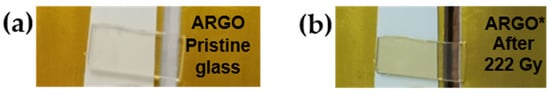 (a) Transparent color before irradiation (ARGO glass sample), (b) yellow color after X-ray irradiation with 222 Gy (ARGO* glass sample).