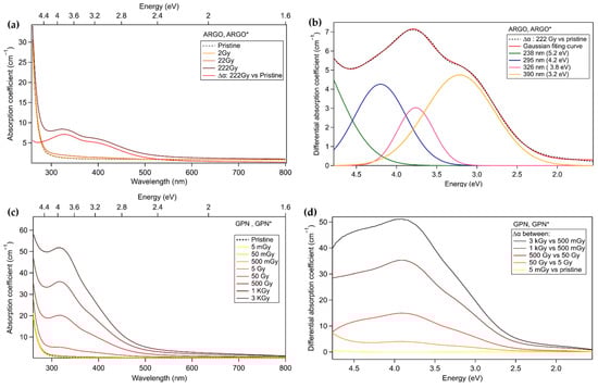(a) Absorption spectra of the ARGO and ARGO* glass sample after various X-ray doses and the difference absorption coefficient spectrum for 222 Gy vs. pristine. (b) Fit of the radiation-induced spectrum (difference between 222 Gy and pristine) considering Gaussian energy contributions for ARGO and ARGO*. (c) Absorption spectra for the GPN and GPN* glasses for X-ray doses from 5 mGy to 3 kGy []. (d) The difference absorption coefficient spectra between different doses conditions for GPN and GPN* [].