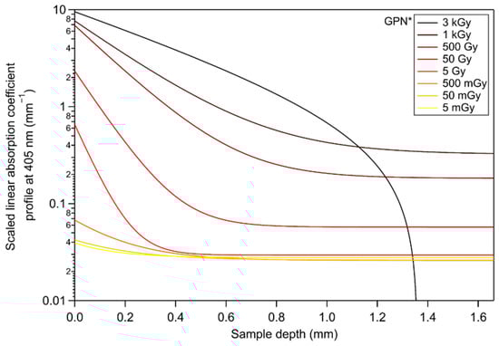 Figure 4a helped us to scale in absolute values and to estimate the depth-dependent profiles of the linear absorption coefficient at 405 nm for different incident X-ray doses (Figure 5). The underlying hypothesis is that the depth-dependent integrated fluorescence emission amplitude (shown in Figure 4a) is locally proportional to the depth-dependent linear absorption coefficients at 405 nm of the defects created by X-rays. Indeed, such depth-dependent linear absorption coefficients at 405 nm are considered to be proportional to the local X-ray dose deposition, and thus to the local density of the depth-dependent defects generated by X-rays (see Appendix A) [].