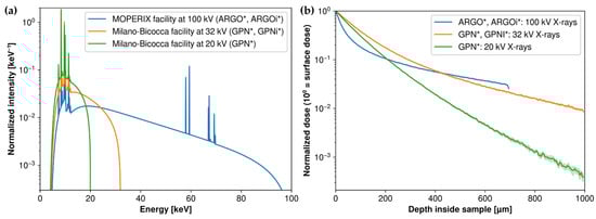 The SpekPy simulation toolkit [] (v2.0.6) was used in order to simulate the X-ray spectrum corresponding to each facility by providing the anode material (tungsten (W) in both cases) and supply voltage (100 KV for ARGO*; ARGOi* samples, 32 KV for GPN*; GPNi* samples and 20 kV for GPN* sample), along with a filtration of 4 mm beryllium (Be) and 10 mm air to take into account, at a first approximation, the drop in lower energies due to inherent filtration of the facilities. The resulting energy spectra are given in Figure 6a. Their shape is explained by the contribution of two components: bremsstrahlung, which shapes most of the spectrum, and characteristic emission, due to electronic transitions inside the atoms of the tungsten anode, resulting in peaks on the spectrum [].