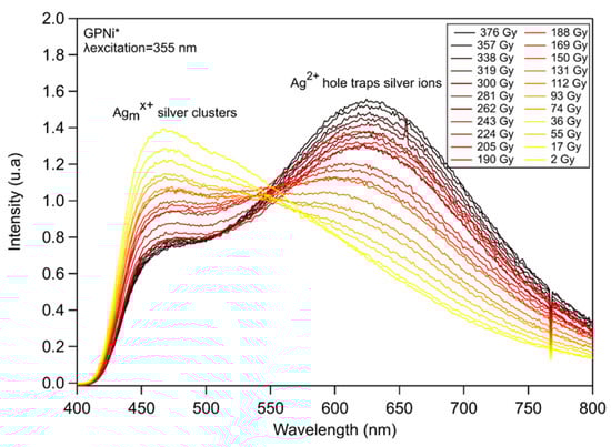 An all-in-one, epi-collected radio-photoluminescence experiment (combining X-rays irradiation and in situ UV excitation at 355 nm) was realized on the GPNi* glass sample. It integrated all the glass thickness and was carried out at the fs laser inscribed structure for an irradiance of 13.4 TW/cm2 at 160 µm below the glass surface. As shown in Figure 7, the spectra present a broadband luminescence centered at 460 nm, attributed to silver clusters AgmX+ inscribed by DLW, with a shoulder at around 620 nm attributed to hole trap defects corresponding to silver ions Ag2+ generated by X-ray irradiation. The spectra represent a spectrum balance as a function of the dose. A significant increase in the Ag2+ luminescence with X-ray doses overlays the DLW silver clusters luminescence, which decreases indirectly due to the absorption at 355 nm of the defects generated by X-ray in the 160 µm thickness from the glass surface down to the localization of the laser-inscribed silver clusters [].
