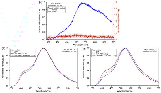 Figure 8b,c, conducted at the DLW structures, demonstrates that the main contribution is centered around 525 nm, with its lowest peak at around 420 nm for the two planes. When irradiating with 222 Gy X-ray dose, one observes that both planes act differently in terms of emission profiles. For the front surface, the 420 nm luminescence band decreases relatively by 13% due to the subsequent partial absorption of fluorescence emission in the blue range because of the absorption of the generated silver species after X-ray irradiation. It is noticeable that, for the rear surface, this band presents a greater relative decrease (about half of its original intensity) due to a larger glass thickness to propagate through before collection. The collected fluorescence in the region from 525 nm to 700 nm gradually increases in the front and the rear surfaces after 222 Gy X-ray dose. It corresponds to the additionally collected fluorescence emitted from the color centers Ag2+ in the sample thickness from the depth localization of the laser-inscribed silver clusters up to the surface. The photoluminescence of the pristine irradiated sample at 222 Gy, as shown in Figure 8a, demonstrates well that the red region (525–700 nm) corresponds to the generation of color centers in the irradiated glass sample. The spectrum of ARGOi* glass sample is several orders of magnitudes larger (×20) as compared to the one in ARGO* glass sample (see blue curves from Figure 8b,c compared to that of Figure 8a). One observes that the non-normalized spectra in the rear surface (not shown here) present a balance as a function of the dose in the silver clusters bands (420 and 525 nm) for the 0 and 2 Gy X-ray doses while the entire fluorescence spectra decrease after 22 and 222 Gy.