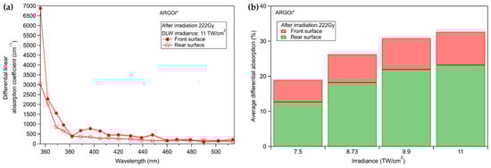 (a) Differential linear absorption coefficient of the laser-inscribed structures (11 TW/cm2) for the two planes after irradiation at 222 Gy X-ray dose in the ARGOi* glass sample. (b) Average differential absorption of the inscribed structures for all DLW irradiance (as from Figure 9a).