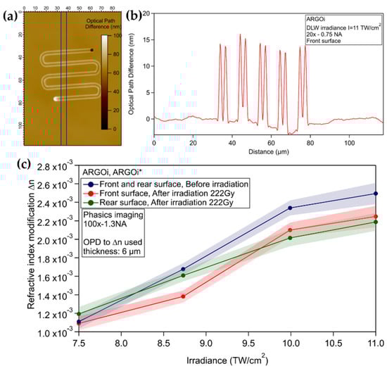 (a) Phase image under white light illumination of the laser inscribed structure (11 TW/cm2) before irradiation. (b) Optical path difference determined from the phase image. (c) The refractive index modification as a function of laser irradiance before/after 222 Gy-dose for the two planes in ARGOi, ARGOi* glass sample.
