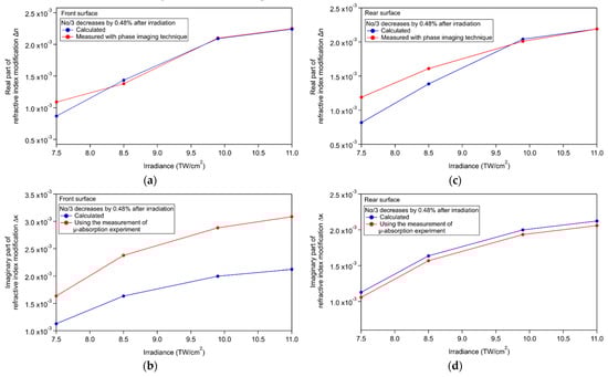 In the front surface (Figure 11a), the calculated real part of the local refractive index modification superposed well with the measured one when weakly decreases by 0.48%. A difference is observed in Figure 11b, as the imaginary part measured is higher than the calculated one in the front surface. In the rear surface (Figure 11c,d), the calculated real and imaginary parts of the local refractive index modifications closely match with the measured one. One can notice that the decrease in by 0.48% after irradiation is negligeable compared to the decrease in the local refractive index modification (approximately 12% after irradiation in Figure 10c). This underlines that the decrease after irradiation seen in the phase imaging technique is attributed to the modification of the cluster’s environment due to the creation of colored centers, i.e., the variation of the ambient polarizability of the irradiated matrix. The two curves comparing the imaginary parts of the front surface in Figure 11b show a significant difference: achieving their matching would require a much larger increase in , by approximately 30% (instead of a decrease of 0.48%). This suggests additional absorption in the front-surface structures during the 222 Gy irradiation, resulting from the creation of additional silver clusters in the front surface.
