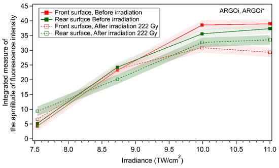 Integrated measure of the amplitude of fluorescence intensity for the different laser irradiance before and after 222 Gy-dose for the two planes in ARGOi and ARGOi* glass sample.