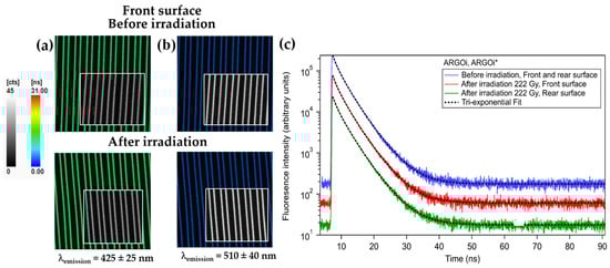 As shown in Figure 13c, the fluorescence lifetime was evaluated with a triple exponential decay model in the ns range. The luminescence decays were normalized and shifted in axis for better vision. However, it is not attempted thereby to attribute each component to a precise population of emitters. Based on the fittings, the three fluorescence lifetimes for all laser-inscribed structures do not change before and after irradiation for the two planes for an emission at 425 nm as well as for an emission at 510 nm. The variation remains well below the accuracy of the measurement. Their associated amplitudes are also stable when comparing before and after X-rays. From the analysis of the fluorescence decays for all DLW irradiances, before and after irradiation, lifetimes and associated amplitudes average values with their standard deviations were derived and reported in Table 4. The peak intensities were between 6.6 × 103 and 1.5 × 104; the average chi2 was 1.05 with a standard deviation of 0.05.