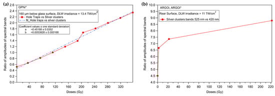By evaluating the dose-dependent evolution of the amplitude ratio of hole traps versus that of silver clusters in the GPNi* glass sample (Figure 14a), a linear response is obtained, exhibiting a slope of sensibility ~0.005/Gy over the 2–357 Gy range. The precision of the dose sensitivity in this glass was estimated at 7% error for a 1 mm sample thickness in the dose range of 2 to 357 Gy. This precision can change depending on the depth of the silver cluster and thus on the material thickness crossed by X-ray irradiation. Concerning the ARGOi and ARGOi* glass sample, the dose-dependent evolution of the amplitude ratio of the two silver clusters bands (525 nm vs. 420 nm) presents a highly nonlinear response in the dose range 0–222 Gy. A saturation starts to occur from the 2 Gy X-ray dose (Figure 14b). Oppositely, a highly-varying evolution could be achieved with X-ray doses less than 2 Gy for this glass sample in the rear surface. It is not evident to have a dosimetry behavior in this dose range (2 to 222 Gy) using this glass sample. However, the ARGOi* glass sample presents a very strong dynamic for X-ray doses of less than 2 Gy, having a slope sensibility ~1/Gy over 0–2 Gy, which could be of interest to high-sensitivity dosimeter in this range [].