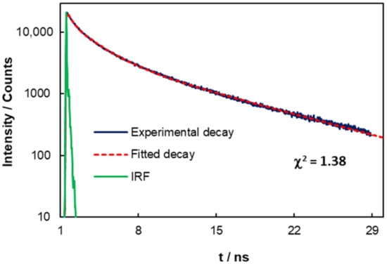 Fluorimetric titration data of diluted aqueous dispersions of C-dots (0.01 mg/mL) with known amounts of the NAs were acquired in RA geometry. Correction of fluorescence intensities due to the hetero-inner filter effects was conducted by the expression: η = Ax0Ay0(1 − 10−Axi)(1 − 10−Ayi)/AxiAyi(1 − 10−Ax0)(1 − 10−Ay0), where Ax0 and Ay0 are the C-dots absorbances, and Axi = Ax0 + ∆Axi and Ayi = Ay0 + ∆Ayi are the total absorbances of the C-dots and the NAs (∆Axi and ∆Ayi) at the excitation and emission wavelengths, respectively [50]. The limit of detection (LOD) was determined in accordance with the 3σ IUPAC criteria [51]. Time-resolved fluorescence intensity decay data were obtained by the time-correlated single-photon counting (TCSPC) method using a mode-locked DPSS Nd:YVO4 green laser (Vanguard 2000-HM532, Spectra Physics Inc., Santa Clara, CA, USA) synchronously pumping a cavity dumped dye laser (701, Coherent, delivering frequency-doubled 3–4 ps pulses of approximately 40 nJ/pulse at 3.4 MHz) working with DCM. Emission light was detected by a Hamamatsu 2809U-01 microchannel plate photomultiplier. The excitation wavelength used was 340 nm. Experimental intensity decays were fitted to the multi-exponential model: