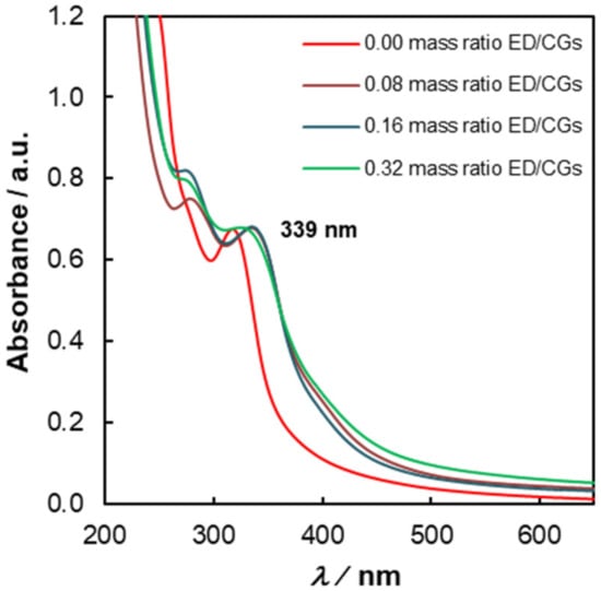 UV–Vis spectra of aqueous dispersions (0.1 mg/mL) of C-dots obtained from CGs with different amounts of ED and without additives (see Table 4).