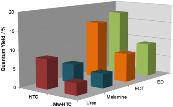 Modification of the surface states of carbon nanomaterials by creation of certain functionalities may also play an important role in improving C-dots’ photoluminescence. In this work, the effect of several additives (ED, melamine, urea, and DET) on the luminescent properties of C-dots in comparison to neat feds was investigated (Table 3).