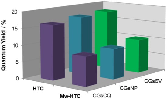The best quantum yield (0.18) was obtained for a reaction temperature of 300 °C, although with the lowest reaction yield. This result was somewhat unexpected, because it is usually reported that on increasing the reaction temperature on solvothermal methods, the component of the emission that eventually would have its origin on the molecular type emitters, many times invoked as the main emitters in nanoparticle ensembles, would fade out. This behavior is usually noted in citric acid-based C-dots [56].