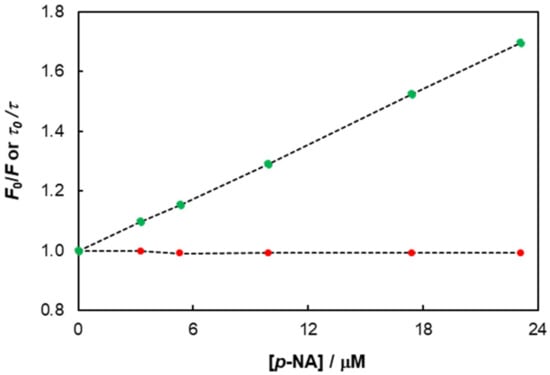 Steady-state (green dots) and time-resolved (red dots) Stern–Volmer plots of aqueous dispersions of C-dots (0.01 mg/mL) in the presence of increasing amounts (3.26 × 10−6 M–23.1 × 10−6 M) of p-NA.