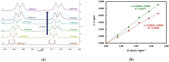 (a) Partial 1H NMR spectra of titration of p-NA (5 mM in D2O; (A) by C-dots (increasing concentration (B)–(F) at 25 ºC; (b) CIS of p-NA aryl protons with increasing C-dots concentration.