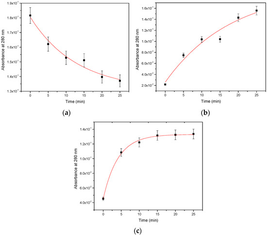 Absorbance at 280 nm of films over time submerged in a solution of ultrapure water spiked with a concentration of EE2 of 10−12 M of (a) (PAH/GO)5, (b) (PAH/PAZO)5, (c) (PEI/PSS)5 thin films.