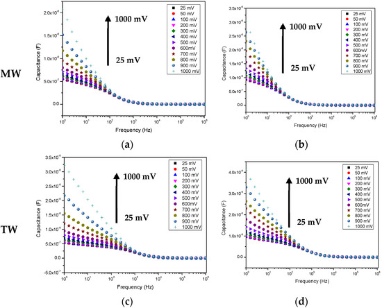 Capacitance spectra of the sensor devices, when immersed in water solutions with a concentration of 10−12 M of EE2, for a range of applied voltages: (a) uncoated IDE in MW, (b) IDE coated with (PEI/PSS)5 film in MW, (c) uncoated IDE in TW, (d) IDE coated with (PEI/PSS)5 in TW. The relative error is less than 1%. Arrow indicates the evolution of voltage values, from 25 mV up to 1000 mV.