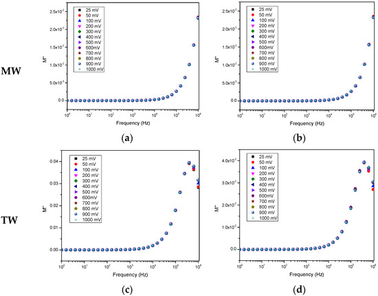 Spectra of the imaginary component of the electrical modulus (M’’) of the sensor devices, when immersed in water solutions with a concentration of 10−12 M of EE2, for a range of applied voltages: (a) uncoated IDE in MW, (b) IDE coated with (PEI/PSS)5 film in MW, (c) uncoated IDE in TW, (d) IDE coated with (PEI/PSS)5 in TW. The relative error is less than 1%.