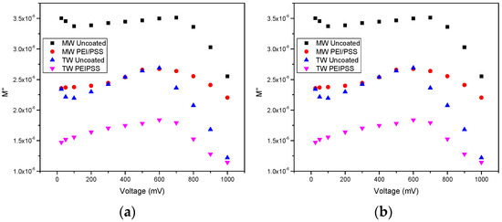 Plots of the (a) capacitance and (b) imaginary component of the electrical modulus (M’’) as functions of the varying voltage applied to the sensors (uncoated and with a (PEI/PSS)5 thin film) in both types of water, MW and TW, for 1 Hz and 2 × 105 Hz, respectively. The relative error is less than 1%.