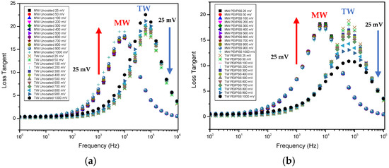 Figure 6a,b illustrated how similar sets of sensors (uncoated and coated with (PEI/PSS)5, respectively) react when in the presence of different waters. Both plots convey similar information, given that in both, the loss tangent allows to differentiate between water types, MW and TW, through a right shift of the tap water-related curves, and also displays the ability to better distinguish each voltage applied (TW being the best scenario) while simultaneously exhibiting an ordered sequence of these values, as indicated by the red and blue arrows in Figure 6.