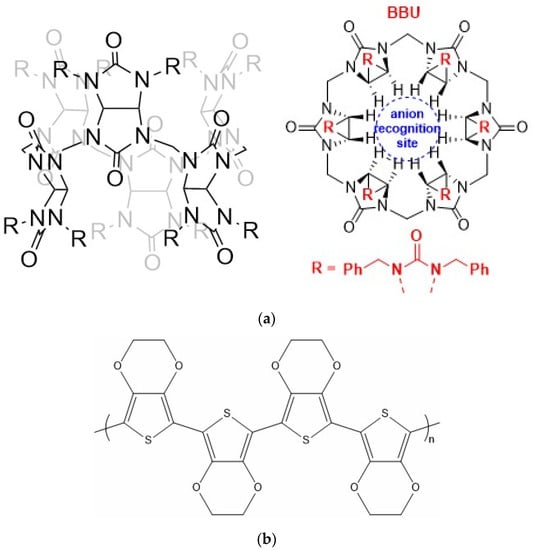 The chemical structure of dodecabenzylbambus[6]uril (Bn12BU[6] = ionophore) (a) and poly(3,4-ethylenedioxythiophene) (PEDOT, conjugated polymer in its undoped form) (b).