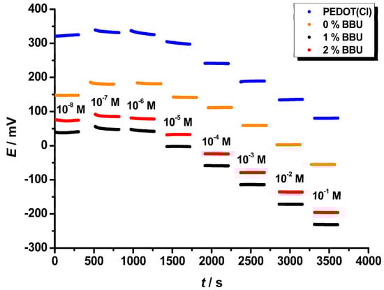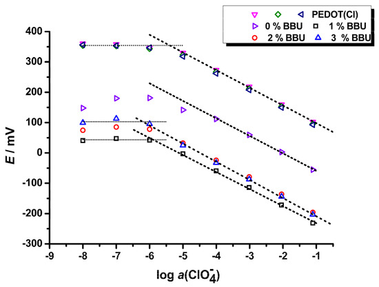 As illustrated in Figure 4, the electrodes with ISM show a fast and stable potentiometric response in the concentration range 10−6–10−1 M, while the GC/PEDOT electrode responds in a narrower range 10−5–10−1 M, which was also observed elsewhere [84]. To elucidate the function of BBU as an ionophore, the ISM containing only TDMACl (Table 2—Electrode 2) was used for comparison because of the anion-exchange properties of TDMA+. The calibration plots show that the Nernstian slope (~−57.7 mV/log a(ClO4−)) is valid for a narrow concentration region 10−4–10−1 M (see Figure 3 and [84]) in comparison with ISM containing the BBU ionophore (Figure 3), which suggests the important role of the BBU receptor. The impact of BBU as an ionophore is important because it extends the linear response range from 10−4 M to 10−6 M (Figure 4).