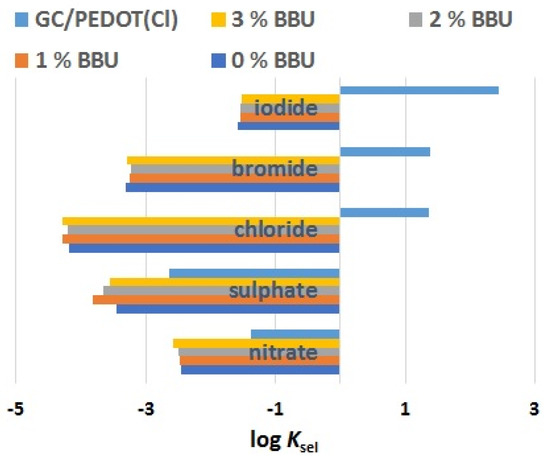 To elucidate the response mechanism of ISEs for the detection of perchlorate, the selectivity coefficients were estimated (see Figure 5). The content of BBU ionophore does not influence the values of selectivity coefficients. On the contrary, in comparison with GC/PEDOT electrode, the presence of BBU ionophore in ISM seems to be crucial due to the formation of strong supramolecular complexes with studied anions.