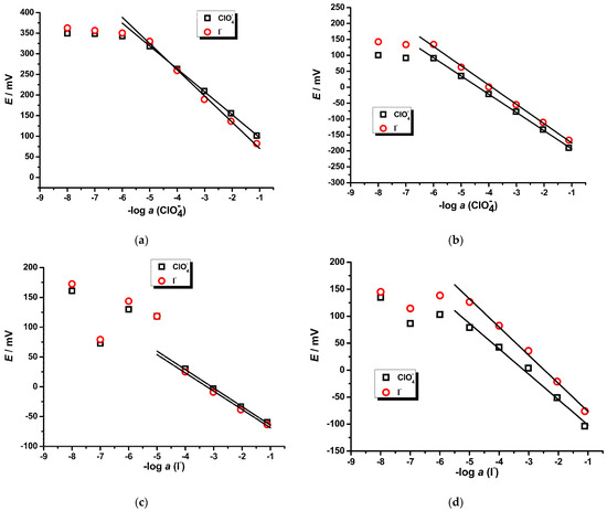 Firstly, the effect between ISEs prepared in different ways was studied. Electrodes 5 and 6 (see Table 2) exhibit the same metrological parameters, e.g., the Nernstian slope, LOD; however, the latter was conditioned in 0.01 M NaClO4 overnight. The same behavior was described in the previous section. Because of similar properties of iodide and perchlorate, e.g., log K(I−@BBU)~log K(ClO4−@BBU) in chloroform [64], the ISE was also soaked in 0.01 M KI solution. As can be seen, the response of the ISE is the same, when the electrode was equilibrated in 0.01 M NaClO4 (Figure 7a,b). Analogous experiments were carried out for the response of the ISE towards iodide (Figure 7c,d), when the electrode was soaked in 0.01 M solution of both salts. One can notice in both cases that the linear concentration region of the calibration plot for iodide was narrower (compare Figure 7a,c and Figure 7b,d) for electrodes with and without ISM. It is interesting that the ISE based on the BBU ionophore can be employed for analysis of iodide in special cases when the perchlorate concentration is negligible. In the opposite case, the perchlorate analysis by ISE could be carried out for samples with low concentration of iodide. This is fulfilled usually for water samples which contain only trace concentrations of iodide. If the concentration becomes higher, there is a possibility of masking iodide by precipitating it as AgI via the addition of silver-nitrate or silver-sulphate solution. If the perchlorate-ISE is stored in 0.01 M NaBr solution, it leads to worse results (e.g., higher LOD, narrower concentration region) than in case when the electrode is soaked in 0.01 M NaClO4 or NaI solution. In addition, this ISE could not be used for bromide and bicarbonate analysis due to its lower selectivity in comparison with perchlorate and iodide. Analogously, the presence of bicarbonate as an interfering anion in samples could be resolved by change of solution pH < 5.