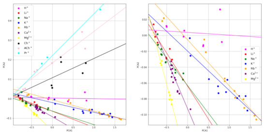 The scores of the first two principal components can also be displayed on a 2D map, which may visually reveal some similarity relations among the raw signals that are not apparent in the original measurement domain. The map of the PC1 versus PC2 principal component scores is shown in Figure 2. The different colors represent the different ions tested. Interestingly, the points corresponding to the signals obtained for different concentrations of the same ion are somewhat aligned. The corresponding least squares regression lines were obtained and they are shown in the figure. As can be seen, the slopes obtained are different for each ion studied, except those for Li+ and Na+, which are similar to each other, which may enable for the ion identification. Thus, from the experimental signals of an unknown ion sample obtained at two different dilutions, the corresponding slope of the plot PC2 versus PC1 can be calculated and, from the value obtained, the ion can be identified.