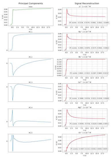 Principal component analysis has proven to be a powerful tool in sample classification from potentiometric measurements obtained from an array of electrodes [22,23] and from transient potential signals. For this reason, a principal component analysis of the whole pool of transient signals shown in Figure 1 was performed. The first principal component was found to preserve 97.75% of the total variance and the first two components were found to preserve 99.75%.