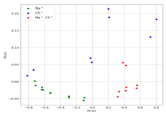 PC2 vs. PC1 map for the Ch+, Na+ mixtures (red) and for Ch+ (blue) and Na+ (green).
