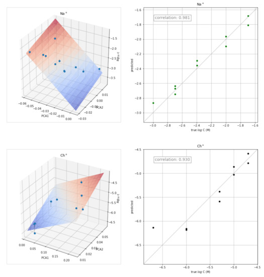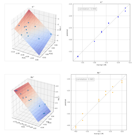 Three-dimensional plots PC1 and PC2 scores versus log C (left) and plots of the concentration values predicted versus the actual values (right) for K+, Rb+, Na+, and Ch+.